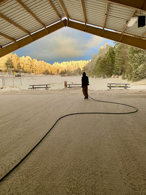 Laying natural ice, Donald explained, could mean working from 8 p.m. until morning, especially as the weather got trickier in recent years: “I found it really neat in my experience of making ice, the coldest time of the day is like 7 to 8 a.m... But just a lot of trial and error. Sometimes it could chip up, sometimes it flake up, sometimes it gets slushy. Like, you name all the different forms of ice—I’ve seen it. Even like Sonic ice!”