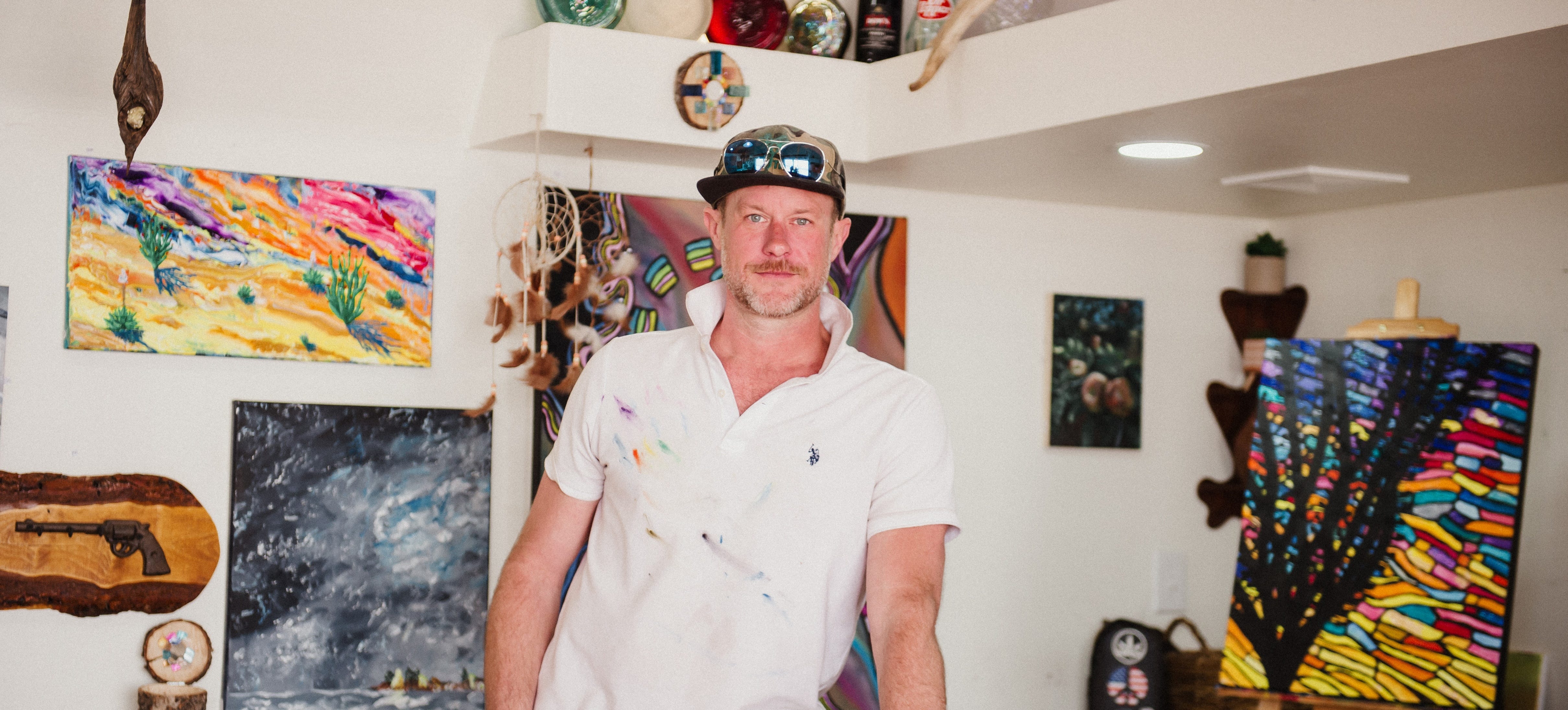 His work is bold and abstract — bright colors, bold shapes, and even sparkles adorn his canvases, which depict yucca, mesas, and Ocotillo cacti. Earthy wood assemblages, crafted from roots and foraged materials, punctuate the gallery walls. “I’m a nerd about wood,” he laughs. “Anything I can find out in the forest.”