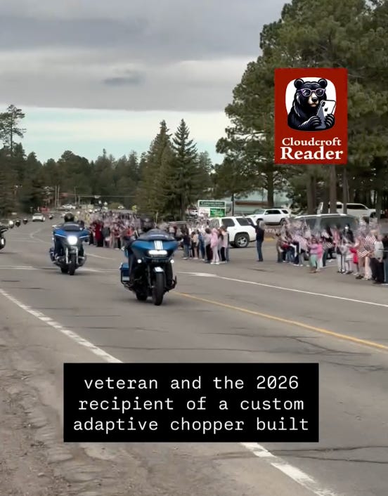 Tuesday, April 14: 75 motorcycles passed through the village alongside disabled Army veteran SSG Shiloh Harris, the 2026 recipient of a custom adaptive motorcycle from the Combat Hero Bike Build organization. Watch, below: